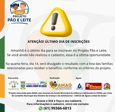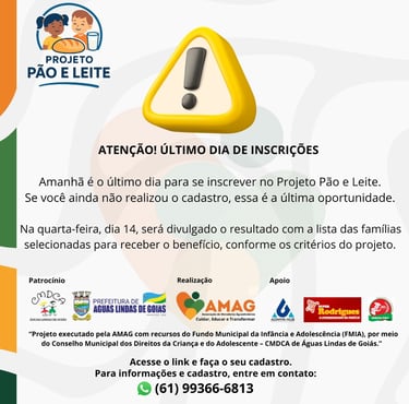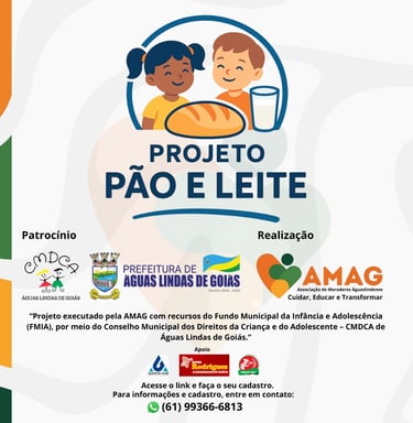 A Associação de Moradores Aguaslindense – AMAG informa que o Projeto Pão e Leite, aprovado no âmbito do Edital de Chamamento Público nº 02/2025, do Conselho Municipal dos Direitos da Criança e do Adolescente – CMDCA de Águas Lindas de Goiás, encontra-se em fase final de inscrições.