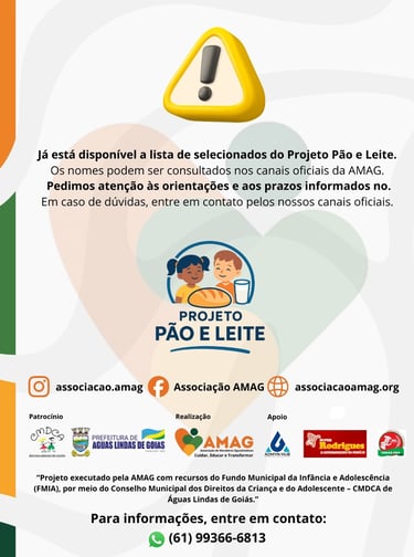 A Associação de Moradores Aguaslindense – AMAG informa que foi aprovada no Edital de Chamamento Público nº 02/2025, do Conselho Municipal dos Direitos da Criança e do Adolescente – CMDCA de Águas Lindas de Goiás, para execução do Projeto Pão e Leite, com recursos do Fundo Municipal da Infância e Adolescência (FMIA).